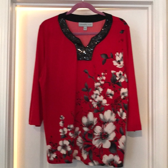Oriental inspired beautiful red tunic with sequin embellished neckline.