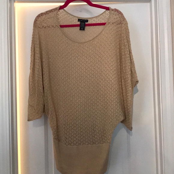 Lightweight beige sweater with batwing sleeves. Some gold threading throughout.