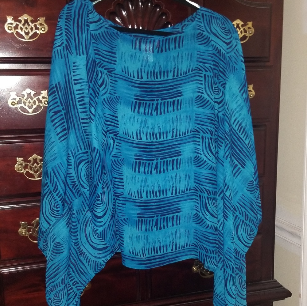 Stunning tunic top in shades of blue and navy. Easily dressed up or down. Perfect for vacation, cruise or a night out.