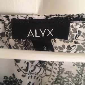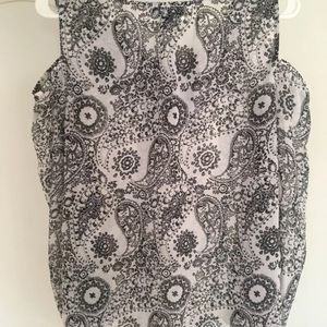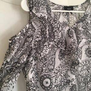 Printed high-low top, with ruffled collar, shoulder-less and quarter sleeves, sized small.