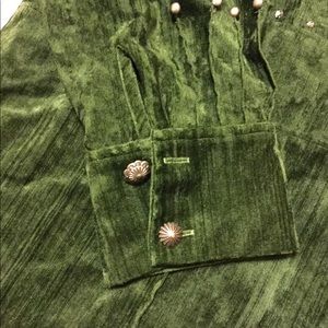 Hunter green lightweight velvet, fully lined, tunic, straight cut. 21 1/2 inches underarm to underarm, dry clean. From the Ralph Lauren collection, worn 1x. I can not locate the fabric but I believe to be cotton and maybe something else, no stretch. There is no label which is odd, I’m thinking it may of fell off and there is no size. I would say a medium to be safe,
