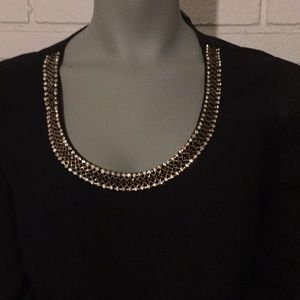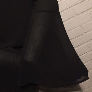 Black top very beautiful on necklace and bell sleeves and length is 23” and bust is 19” 💯 percent polyester brand new