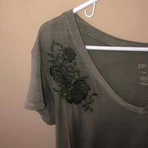 Short sleeve top with flowers at shoulders.