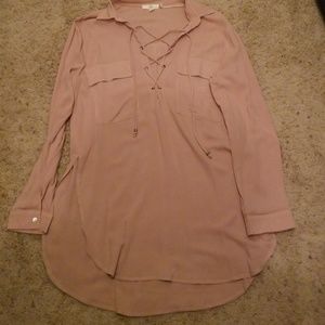 Light brown; long sleeve; light weight (rayon); laces up in the front, high cut on both sides; looks great with leggings or jeans & boots!