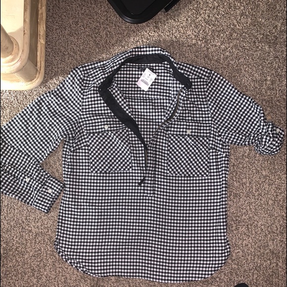 J Crew, black & white checkered top. It’s a small but made a little bigger, so you can layer. Make an offer