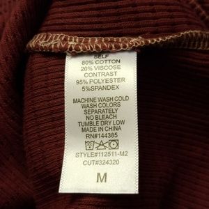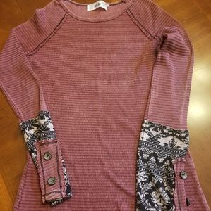 Burgundy with buttons and detailed sleeves. Waffle texture. 17" pit to pit. Lots of stretch! Never worn.