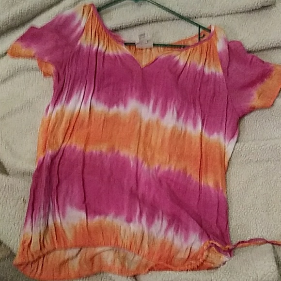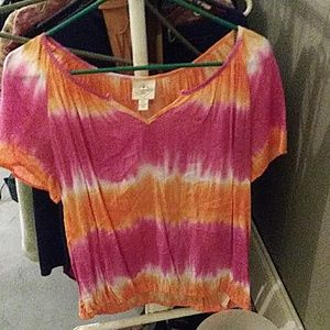 Pink, orange and yellow St. John's Bay short sleeve shirt that's gathered at the bottom