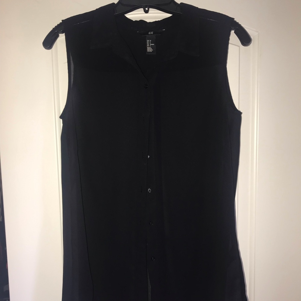 Sheer, needs cami underneath, button down with collar, slightly longer in the back than the front