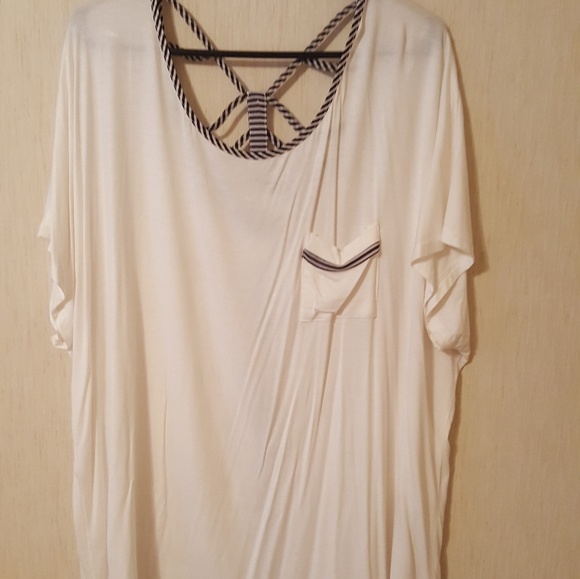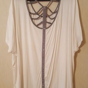White short sleeve top with criss cross upper back design and button down center back