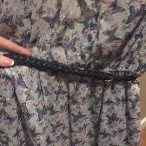 Semi sheer top with a black belt at the waist. It’s a light blue with butterflies on the top.