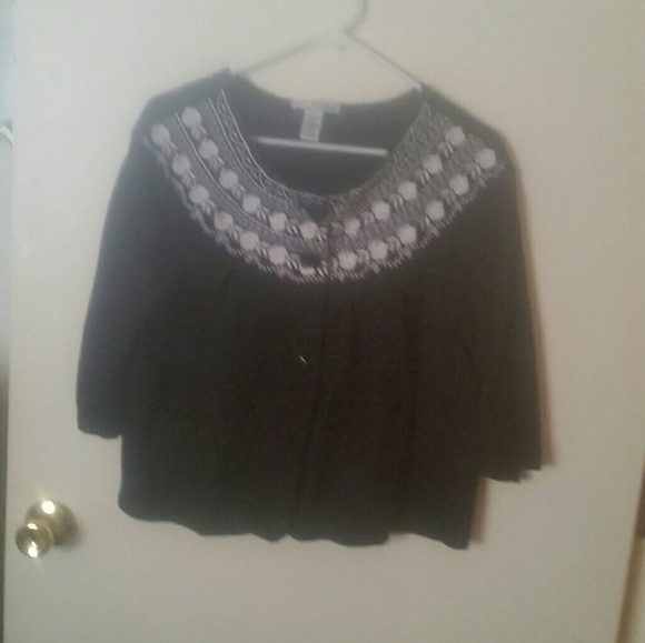 100% cotton black top, pleated front and back, white floral decorative collar. Can be used closed or open with blouse on the inside.