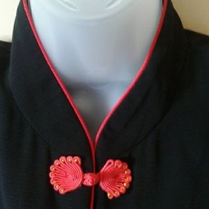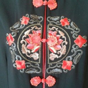 Oriental motif top or light jacket. Labels cut out. Unlined, lightly padded shoulders.