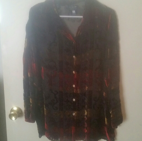Long multi colored, long sleeve for early fall, early spring. Light, button down top that can be worn over a top or a solid dress to make it pop.
