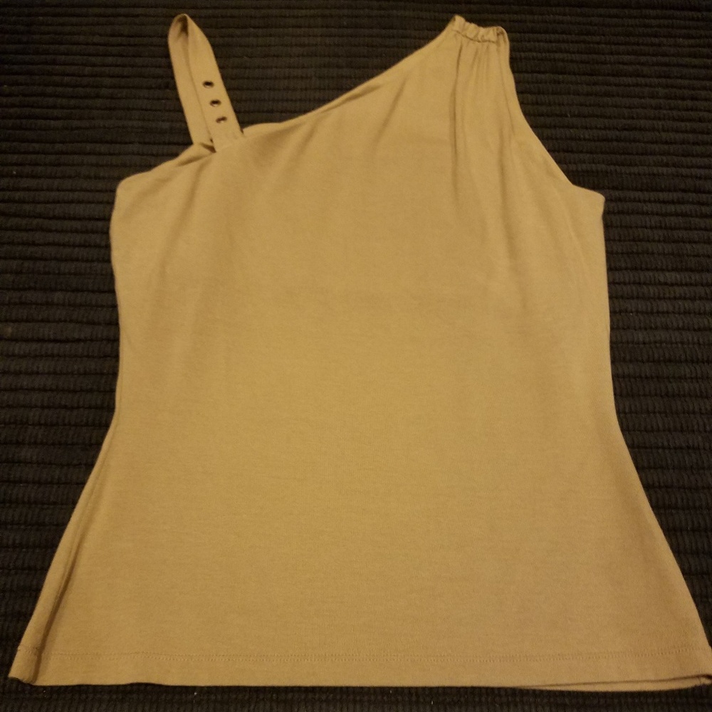 Khaki, grommet accent on one shoulder, sleeveless tank with shelf bra, 93% rayon/7% spandex