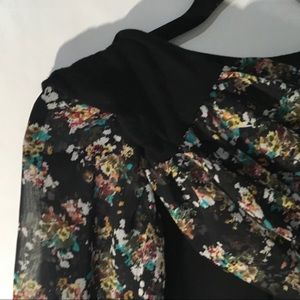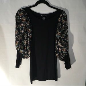 Black top with sheer 3 quarter length sleeves. Cute detail bows on back of top. Measures 20 in long from center of neckline, Armpit to armpit 22 in and length in back from neckline is 25.