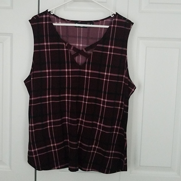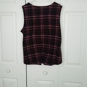 Pink purple plaid with cris cross at neck line / cotton and polyester . Never worn