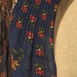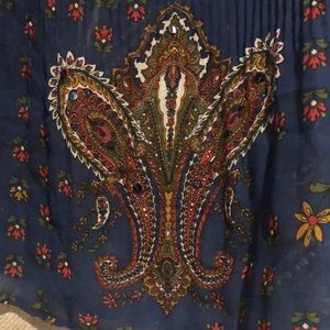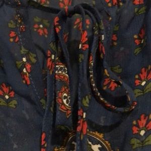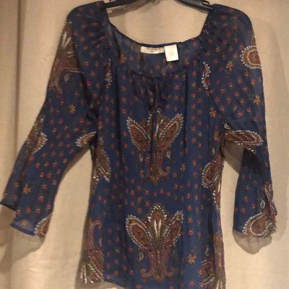 Lightly sheer with light sequins... off the shoulder with tie front. Little gathering detail on sleeves and waist. Awesome color....goes with everything!!!! Gently worn