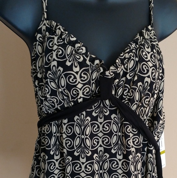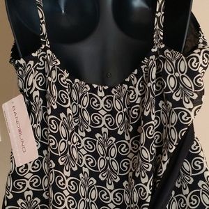 Brand New with tag. Top perfect with jeans or jacket. Colors are black and cream with a black tie that wrapped underneath the breast and goes around to the back. Size 14.