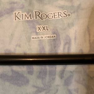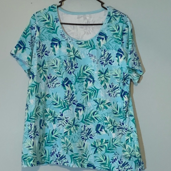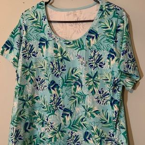 Tee Shirt like top with short sleeve. Like new and never worn. NWOT. Stretchy soft like material. Blues and greens on white color pattern. No odors. Free of tobacco and pet smell.