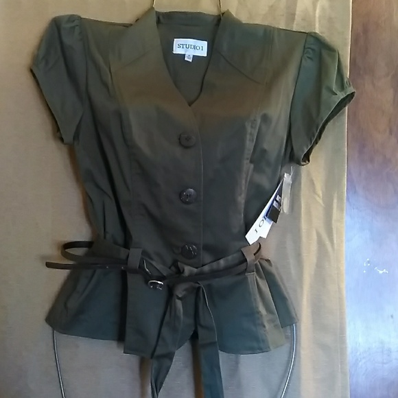 Hunter. Green. Buttons down the front v neckine double belted. Form fitted with a taylored look