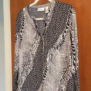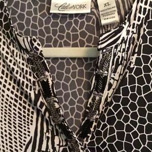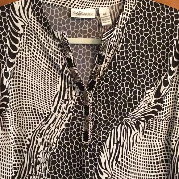 Black and white, long sleeve, 95% polyester 5% spandex. 29 1/2” in length. Beaded at V neckline