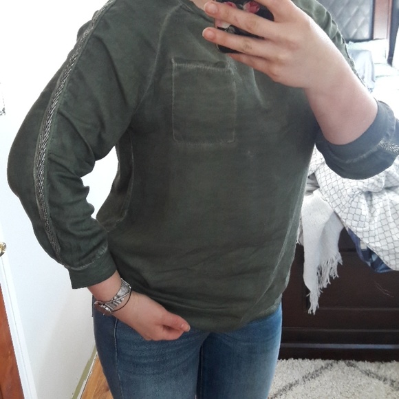 Lightweight green top with decorating pockets and stripes on sleeves. 95%cotton 5% elastin. Worn once