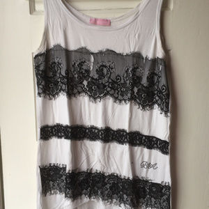 White shirt with decorative black lace in front. Nice soft material, made in Italy, size M.
