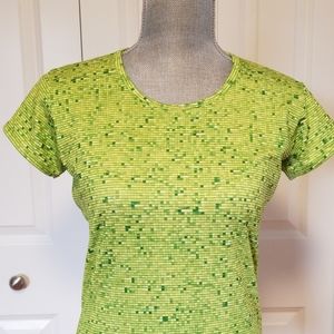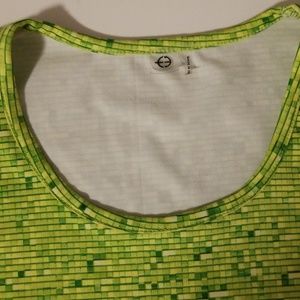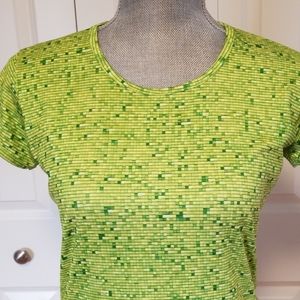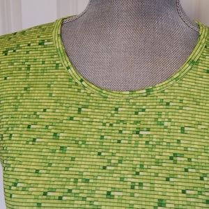 Multi green top. 21 inches long, 17.5 inches armpit to armpit.