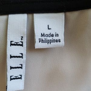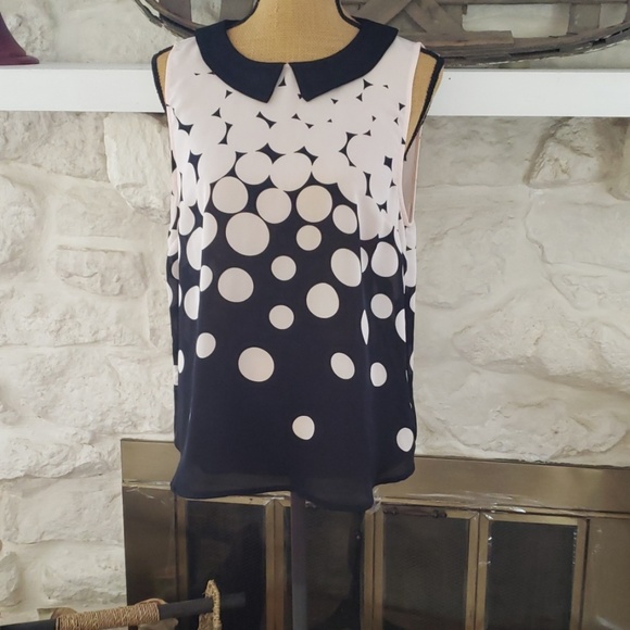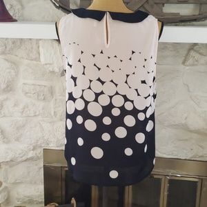 Cute, cute, cute summer top. Lightest pink and black circles with a black collar. Looks great with white or black shorts or crop pants!