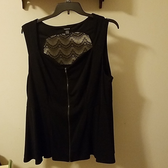 Black, peplum, sleeveless top with zip up from and lace design on upper back