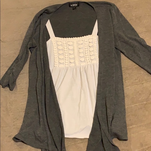 White Tank top and attached grey cardigan scrunched fabric on the sleeves
