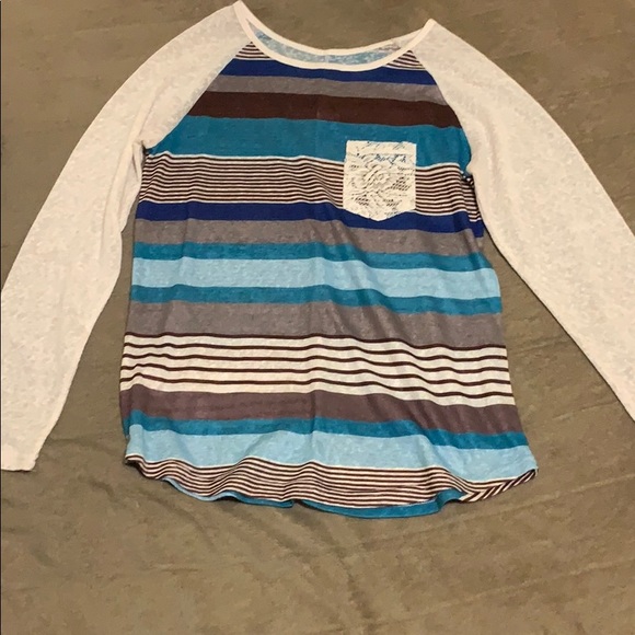 Brown, blue, grey, striped top with flora lace pocket and lace long sleeves