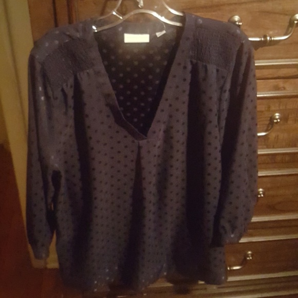 Navy blue top with navy blue polka dots. Top narrows at the waist line.