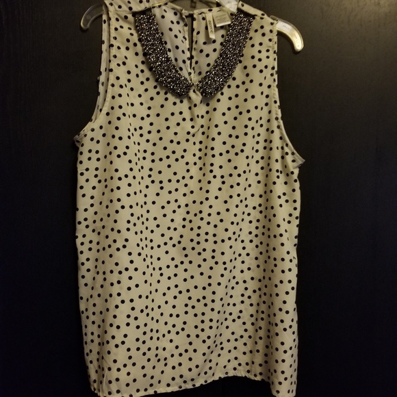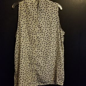 White top with black polka dots. Design around the neck.