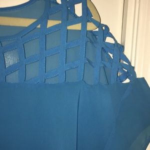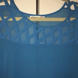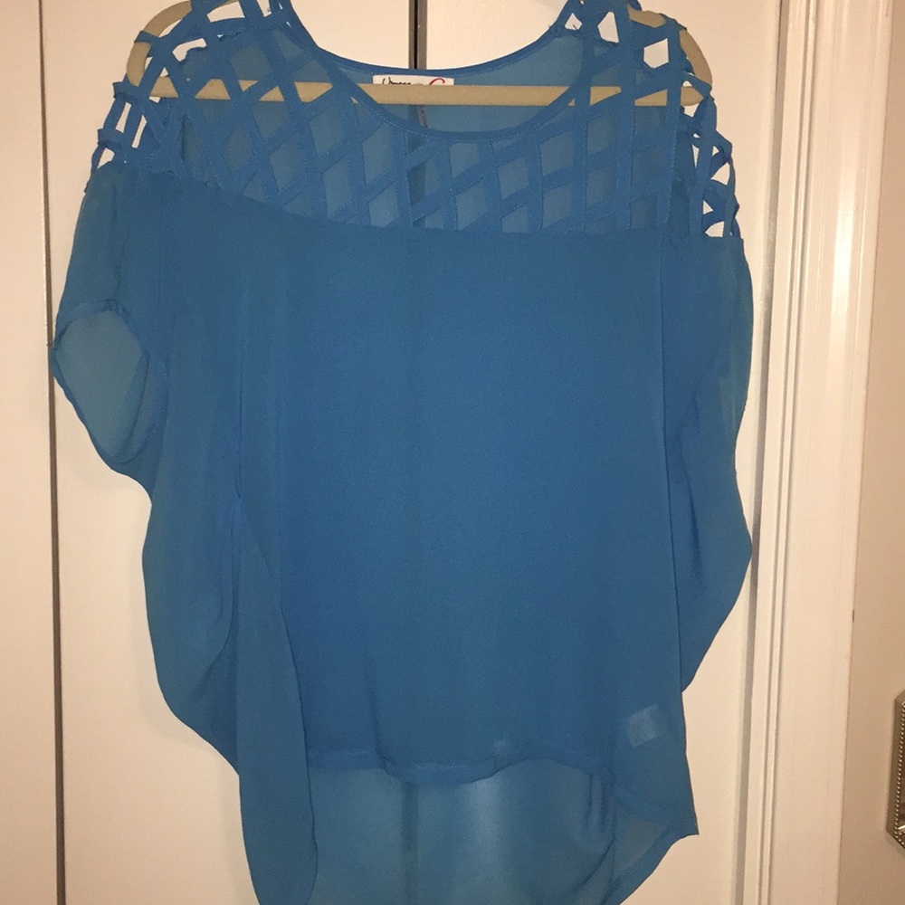 Boutique blue sheer top. Shorter in the front. Longer in the back. Fits very loosely.