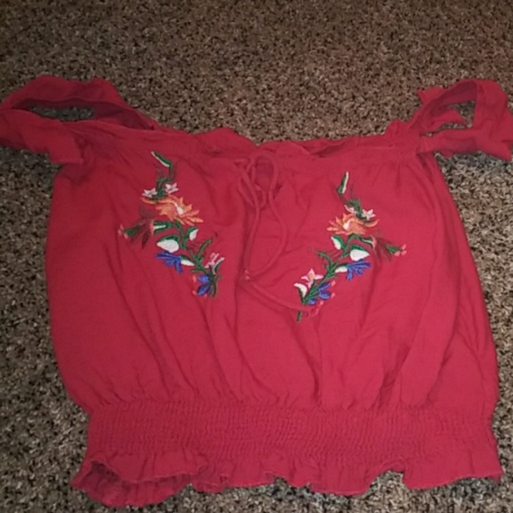 Red crop blouse goes well with high waisted jeans !!
