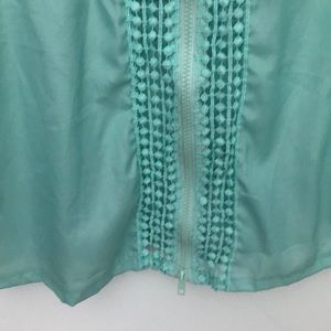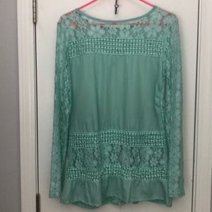 Beautiful turquoise top with lace sleeves,across the top and bottom. Zips up the back size medium