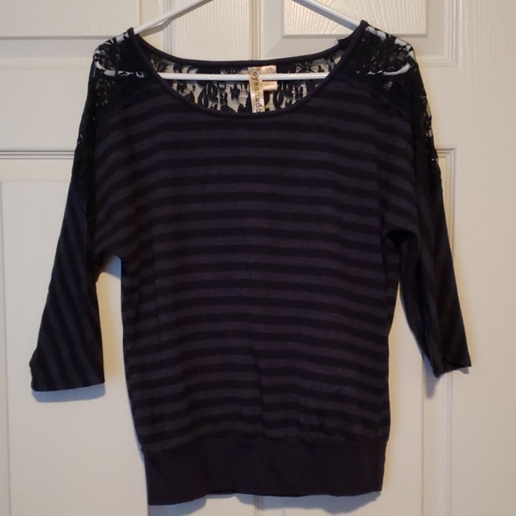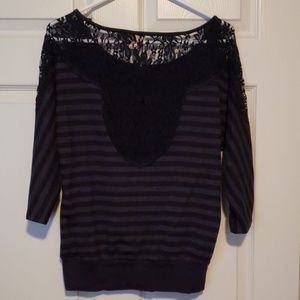 Navy blue striped banded bottom with lace shoulders and partial lace back