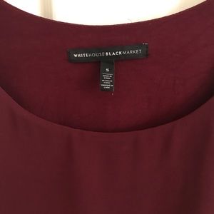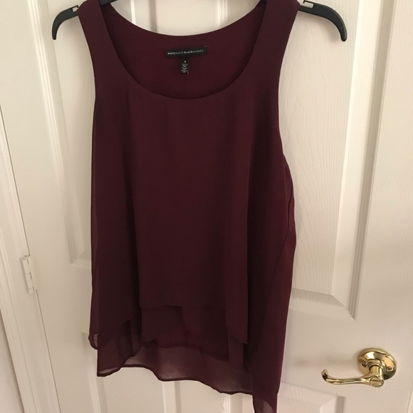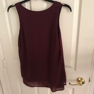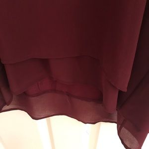 Sleeveless dressy wine color top. Longer in the back. Shell of top is 100% polyester lining is 95% Rayon 5% spandex. Hangs beautifully- looks like many tiers to the top.
