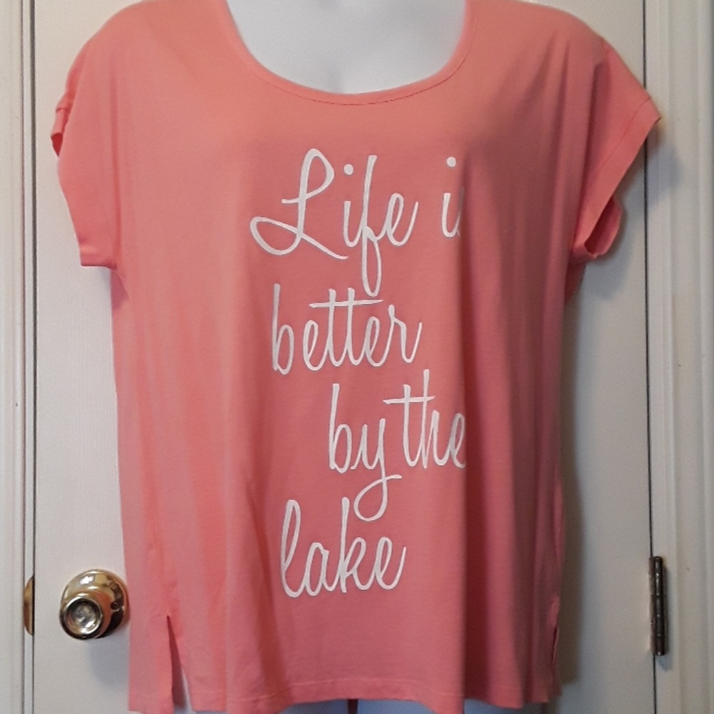 Peach color. Armpit to armpit 22 inches, shoulder to hem 26 inches. Perfect for the summer.