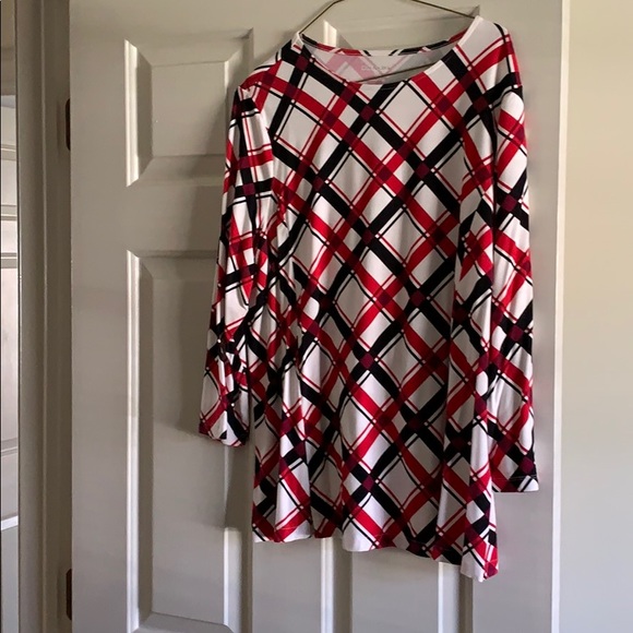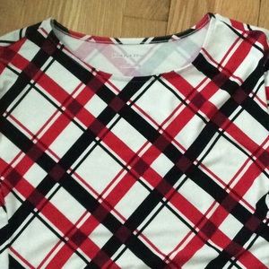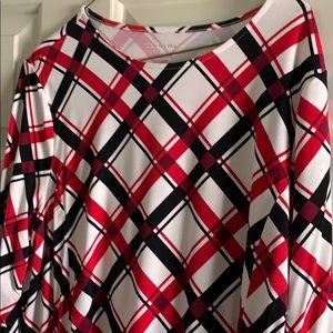 Red/black/white top with 3/4 length sleeves. Seams down the front with small open pleats at the hem.