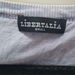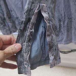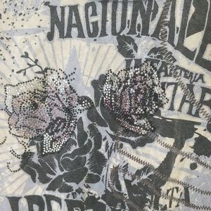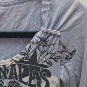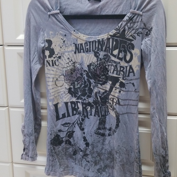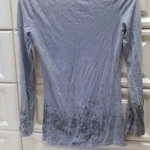 Grayish blue top with sequin Rose's on front. Slits at bottom on sleeves. Large neck line.