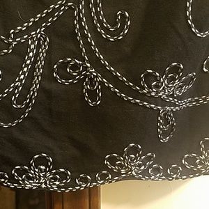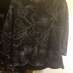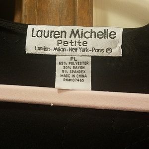 Black three-quarter sleeve top with black and white piping design on front and back Lauren Michelle brand petite large scalloped Hem on bottom
