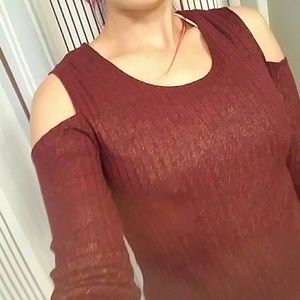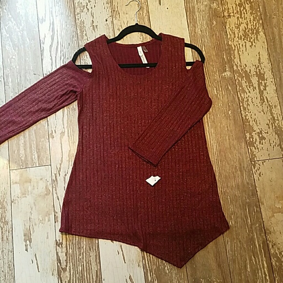 Burgundy light weight top with gold glitter look. Great to wear with leggings it will cover the buttocks area and front.. if you're brave enough wear as a dress a really short dress.