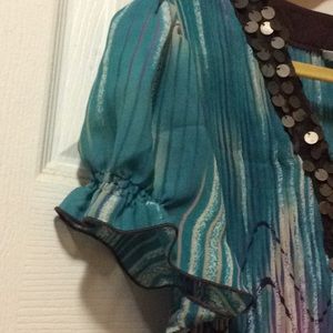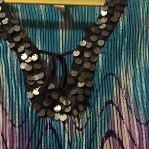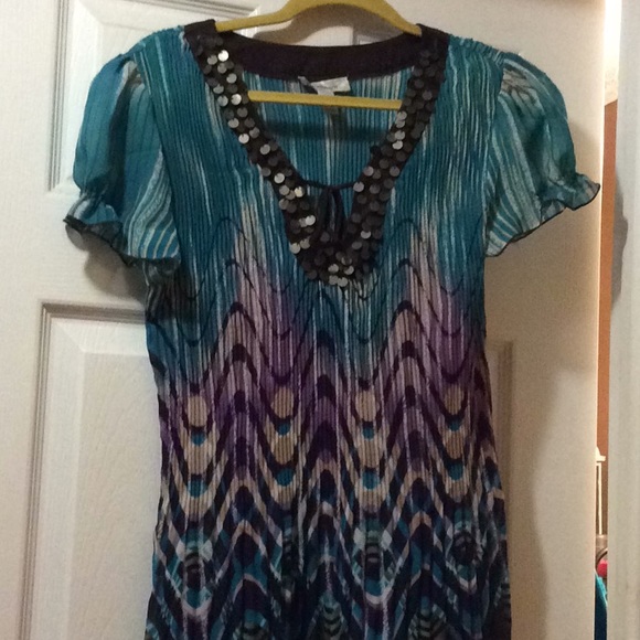 Multicolored top. Details on V neck. Front tied lace. Short sleeve. Beautiful design all over. Dress barn size L Petite.