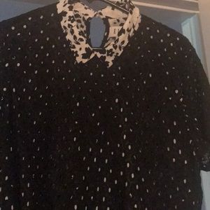 It’s actually a one piece that looks like a two piece ,with pigeonholes type of covering over a floral black and white top nice for the office, casual wear with a skirt ,blue jean,dress pant for every day wear