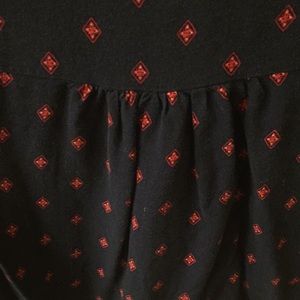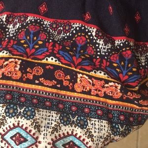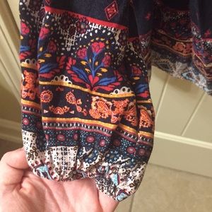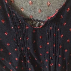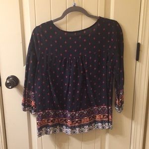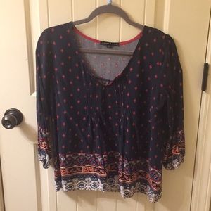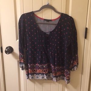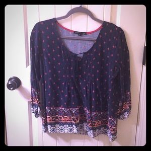 Navy blue, deep pink, colorful, fun print, 3/4 sleeve, v-neck w/strings, lightweight