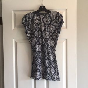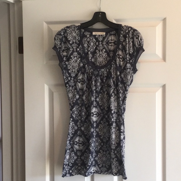 Capped sleeve top by Testament from Anthropologie. Navy blue with bird print. Polyester/cotton