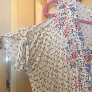 Open shoulder floral top. V-neck with lace thread trim. Tie knot on end of sleeve. Could make a great nursing top. Only sewn together at the base of the ‘v’