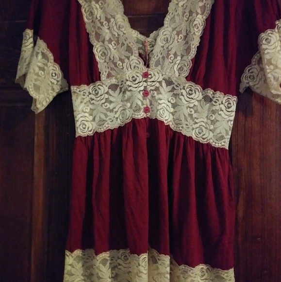 Medium Low cut neckline front and back. Maroon with cream colored lacey arm and neckline.
